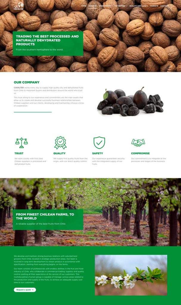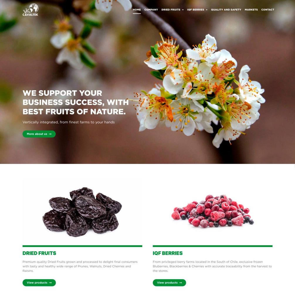Publicamos una nueva versión de su sitio web www.cavaltek.com, orientado a posicionar la marca en el extranjero y consolidar su participación en los diferentes mercados de consumidores de frutas frescas, deshidratadas y congeladas, producidas en Chile y comercializadas en el extranjero.