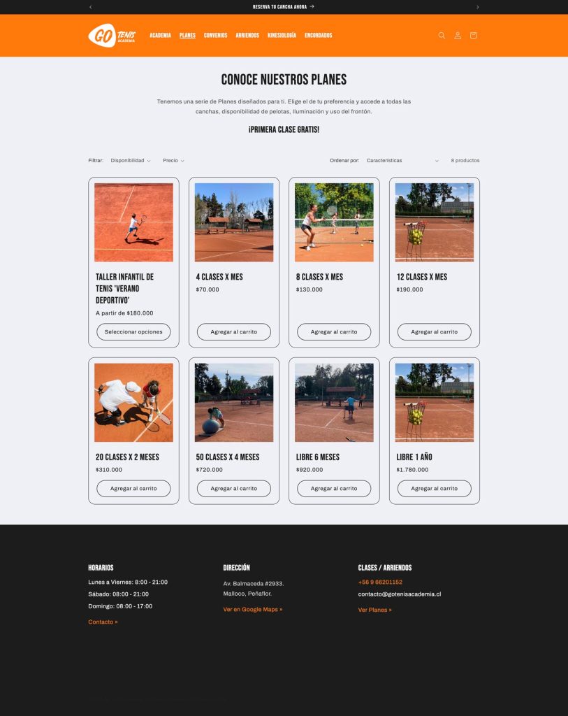 Los clubes deportivos necesitan innovación, y es lo que estamos haciendo en Go Tenis Academia, Club de Tenis ubicado en el Centro de Eventos Munich, Peñaflor. El nuevo sitio www.gotenisacademia.cl fue levantado en Shopify y ofrece la venta de Planes de Entrenamiento y Arriendo en línea de Canchas de Tenis.