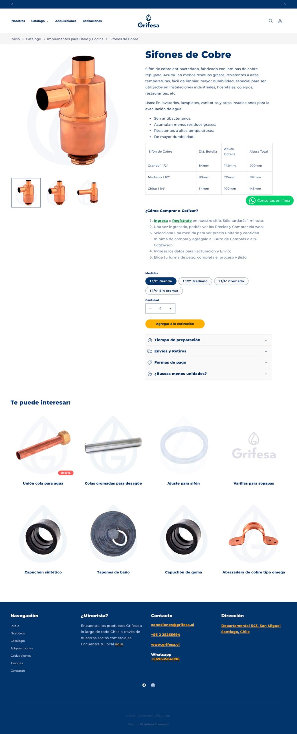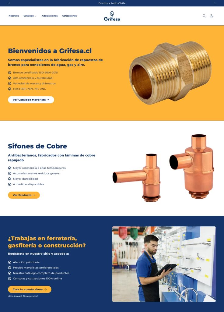 Creamos una nueva versión del sitio web de Grifesa, www.grifesa.cl, migrando el 100% del contenido desde WordPress a Shopify. La nueva web es más intuitiva, orientada a facilitar la adquisición de productos y la solicitud de cotizaciones.